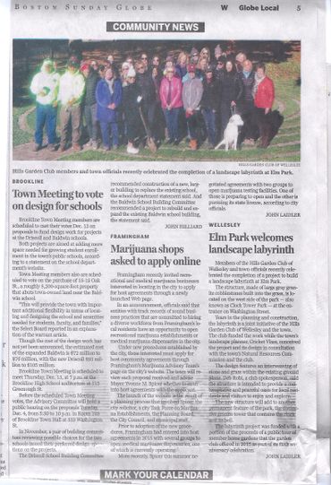 Since its founding in 1955, The Hills Garden Club of Wellesley has proudly been associated with the design, planting, and upkeep of Elm Park, fondly referred to as Clock Tower Park. The Club’s first president, Mrs. A. Dudley Bach, made it the first civic improvement concern of the Club, and in each succeeding year, the Club has carefully and lovingly nurtured the park.